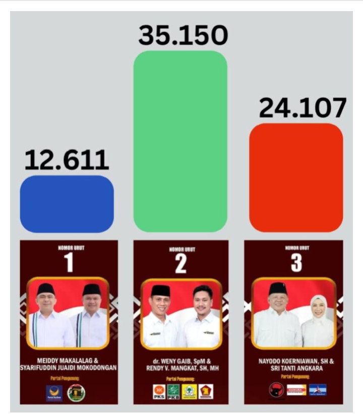 Dengan perolehan suara terbanyak, pasangan Dr. Wenni Gaib, SPM dan Rendi V. Mangkat, SH, MH dari Paslon 2 dinyatakan sebagai pemenang Pemilihan Wali Kota dan Wakil Wali Kota Kotamobagu 2024.