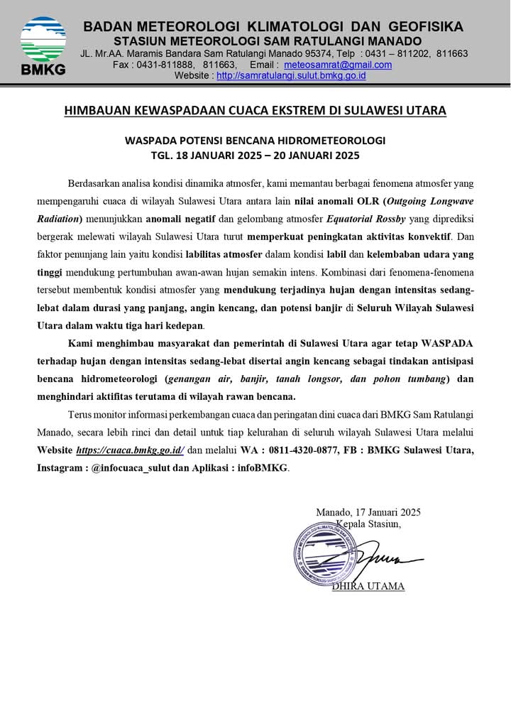 BMKG terus memantau perkembangan cuaca di seluruh wilayah Sulawesi Utara dan akan memberikan pembaruan informasi secara berkala. Masyarakat diharapkan aktif memantau informasi cuaca melalui kanal resmi BMKG, seperti website, aplikasi, dan media sosial. Informasi rinci dan peringatan dini dapat diakses melalui situs [https://cuaca.bmkg.go.id/](https://cuaca.bmkg.go.id/), WhatsApp 0811-4320-0877, Facebook “BMKG Sulawesi Utara”, dan Instagram “@infocuaca_sulut”.