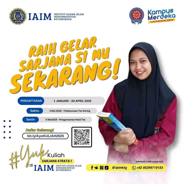 Mari bergabung dengan Institut Agama Islam Muhammadiyah Kotamobagu dan jadilah bagian dari generasi muda yang berkualitas, berdaya saing, dan berkontribusi nyata bagi bangsa. Raih gelar Sarjana S1-mu sekarang dan wujudkan masa depan yang lebih cerah bersama IAIM Kotamobagu! Jangan tunda lagi, segera daftar dan mulailah perjalanan pendidikan Anda menuju kesuksesan. (Idiex)