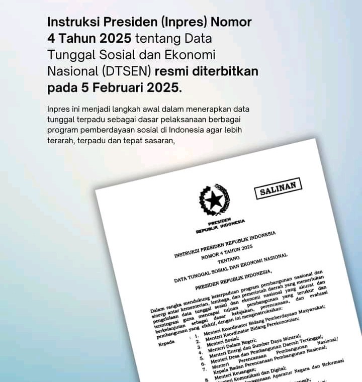 Suarabogani.com, 17 Februari 2025 – Presiden Republik Indonesia resmi menerbitkan Instruksi Presiden (Inpres) Nomor 4 Tahun 2025 tentang Data Tunggal Sosial dan Ekonomi Nasional (DTSEN). Kebijakan ini bertujuan untuk memastikan seluruh program bantuan sosial dan pemberdayaan masyarakat dari berbagai lembaga mengacu pada satu sumber data yang terintegrasi.