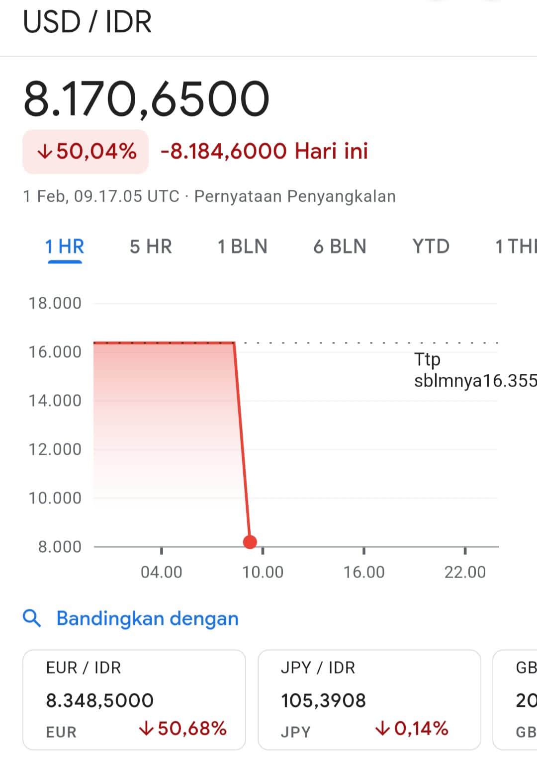 Suarabogani.com, 1 Februari 2025 – Masyarakat Indonesia dikejutkan oleh tampilan nilai tukar rupiah yang tiba-tiba melonjak tajam di Google. Dalam pencarian yang dilakukan banyak pengguna, rupiah terlihat menguat drastis menjadi Rp8.170,65 per USD. Angka ini jauh berbeda dibandingkan kurs yang berlaku sebelumnya, yang masih berada di kisaran Rp16.256 per USD. Kejadian ini pun langsung menjadi perbincangan hangat di media sosial, dengan banyak warganet mempertanyakan apakah ini benar-benar terjadi atau hanya kesalahan sistem.