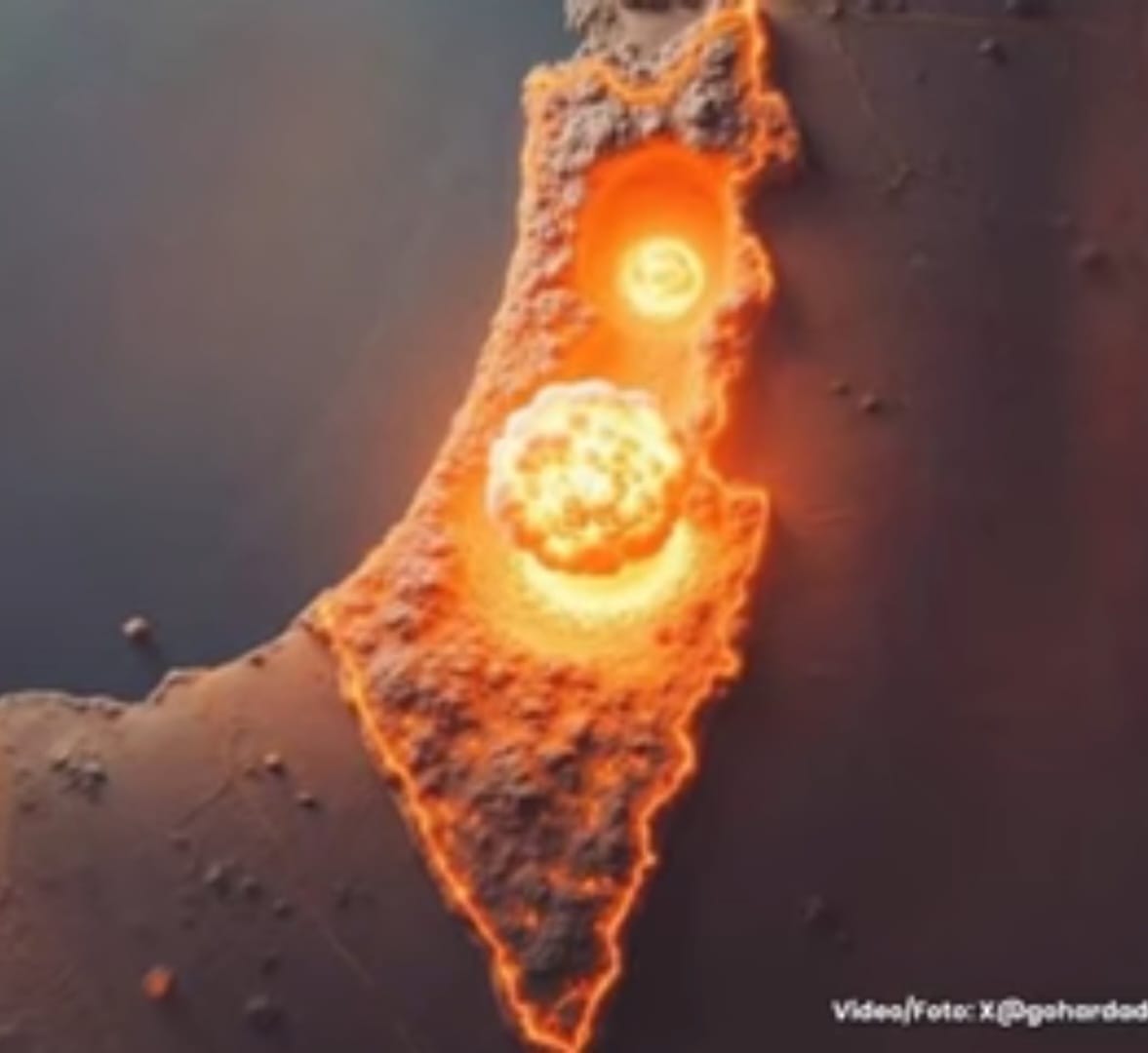 SuaraBogani.com__Sebuah unggahan dramatis dari akun X milik aktivis pro-Iran @pgahardashty mengguncang jagat maya dan memicu reaksi berantai dari komunitas internasional. Unggahan tersebut memperlihatkan simulasi serangan nuklir di atas peta Israel, dengan dua awan jamur menyala yang melambangkan kehancuran total wilayah tersebut.