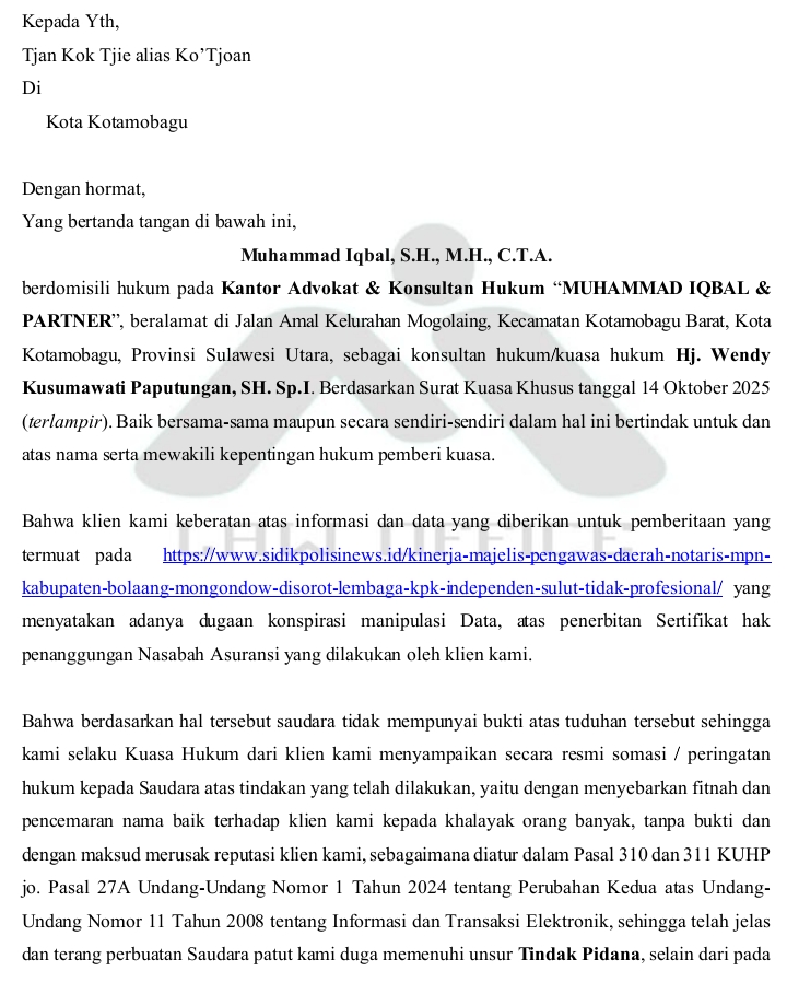 KOTAMOBAGU —Kantor Advokat & Konsultan Hukum “MUHAMMAD IQBAL & PARTNER” yang beralamat di Jalan Amal, Kelurahan Mogolaing, Kecamatan Kotamobagu Barat, Kota Kotamobagu, secara resmi melayangkan somasi kepada Tjan Kok Tjie alias Ko’Tjoan, terkait pemberitaan yang dinilai mencemarkan nama baik kliennya, Hj. Wendy Kusumawati Paputungan, S.H., Sp.I.